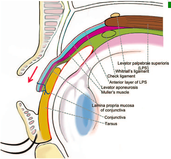 🔼🔼🔼上圖:視樂CL手術示意圖:這是一個新式提眼肌的手術方式,提供一個更有力的提升方式,(藍、紅、綠)三層組織,都是有彈性的,不但拉提有力氣,術後眼睛閉合的程度也比之前傳統的手術改善。