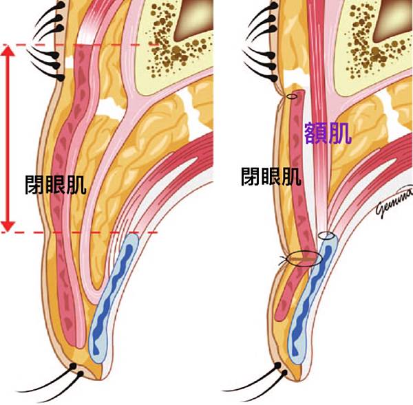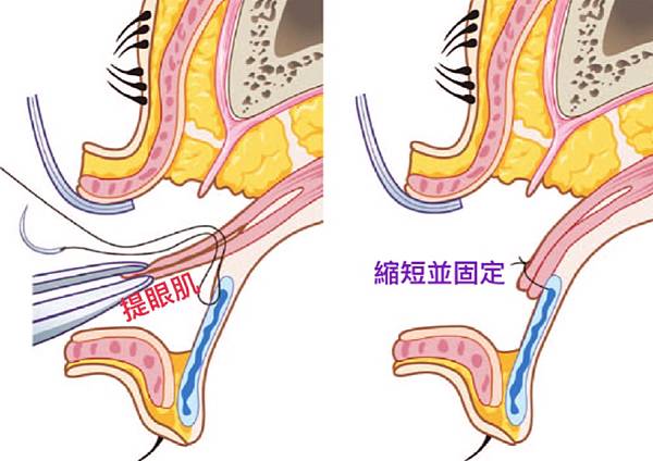 4. 第四種,叫做『超縮提眼肌』(把提眼肌縮得很短)來拉提:顧名思義就是,如果一般都只能縮短1-2公分,能讓眼睛睜開好點,那如果為了要矯正很沒有力的提眼肌,要縮更短,就要縮2公分以上,甚至更多,於是就稱作『超縮』提眼肌!這是利用已經沒有什麼力氣的提眼肌,將其「過度」縮短後,增加眼皮拉力,來提供眼睛睜開的力量!